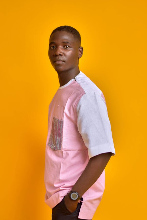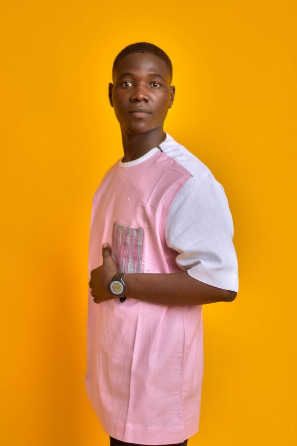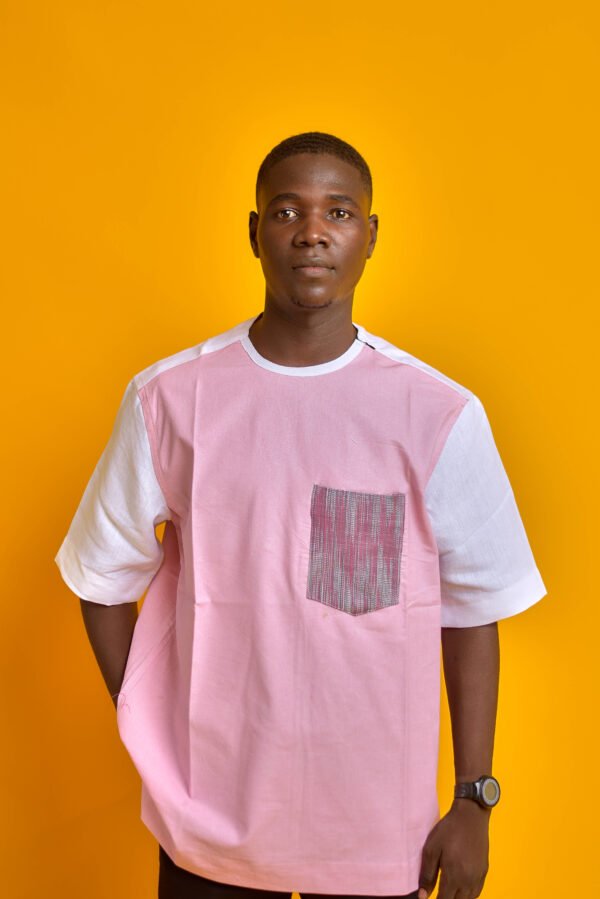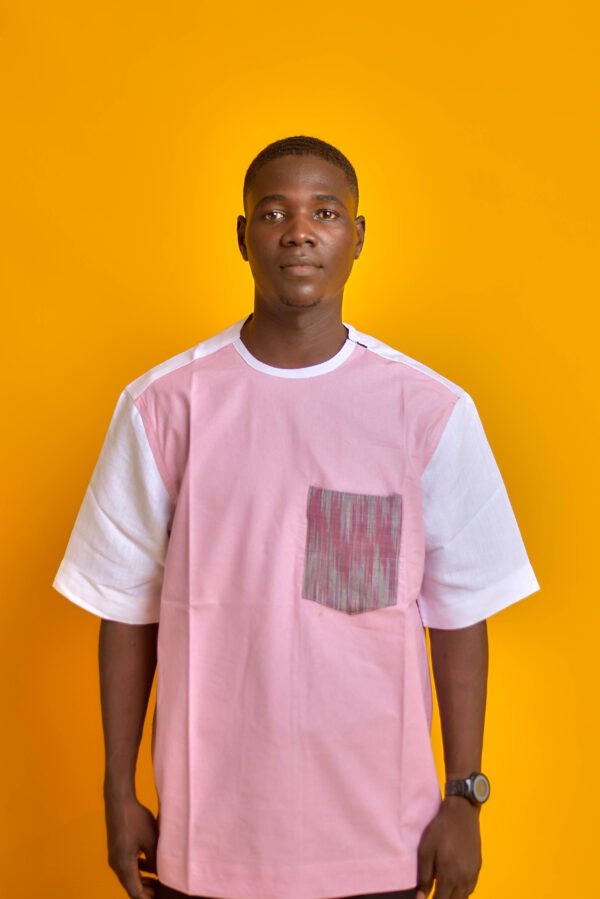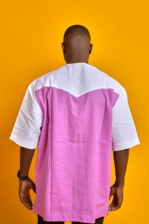 La chemise Hayan, disponible en fuchsia et rose, est une pièce à manches courtes avec un col rond. Elle combine un corps fuchsia et des empiècements blancs sur les manches, agrémentée d’une poche à motif quadrillé blanc et noir. Parfaite pour un style décontracté et coloré.