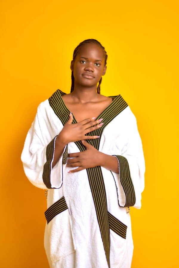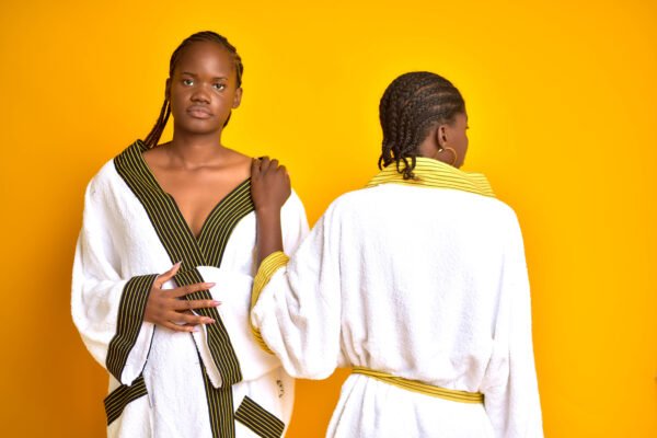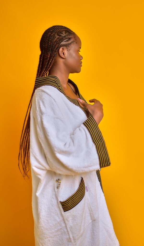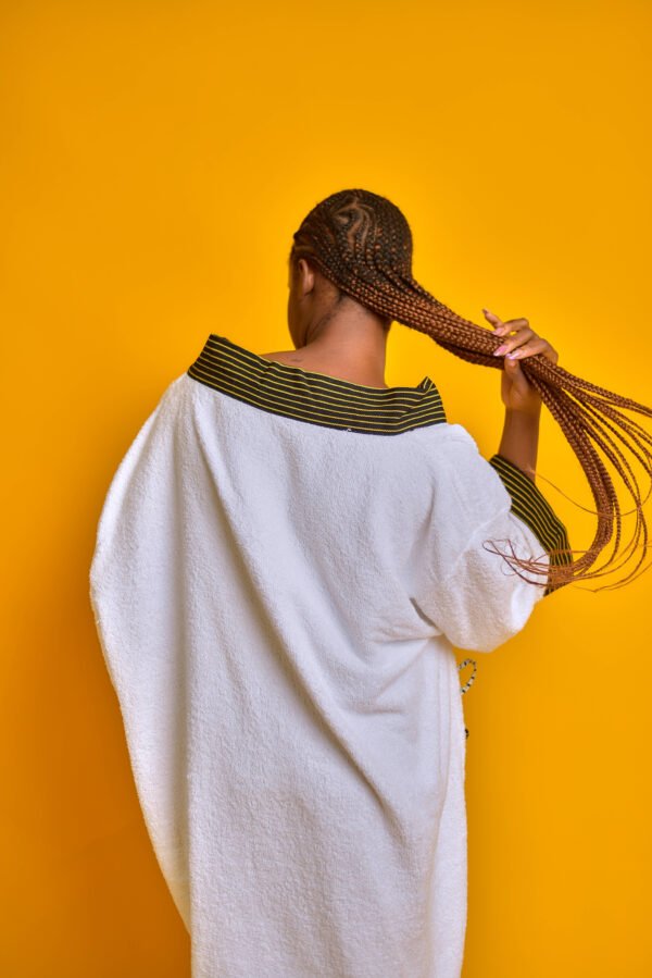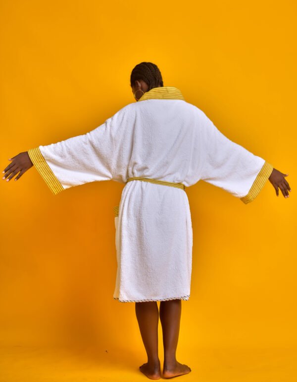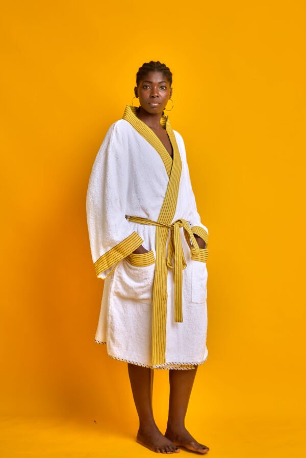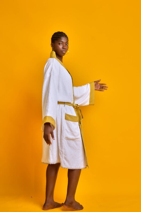Le peignoir femme est un modèle blanc en tissu éponge doux, avec des bordures à rayures noires et jaunes. Il présente un col châle, une ceinture assortie et des manches longues, parfait pour un confort élégant.