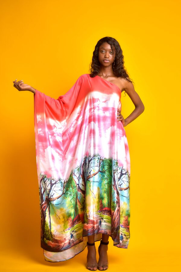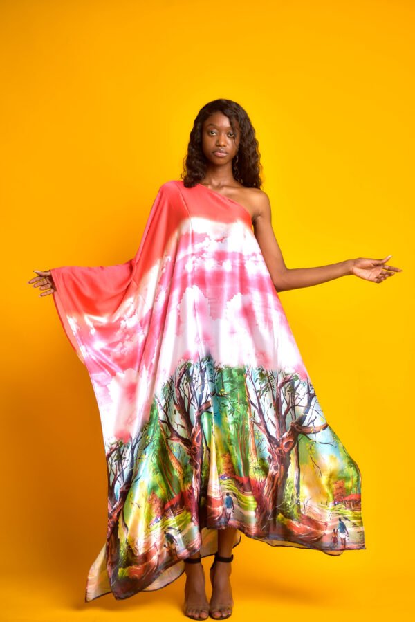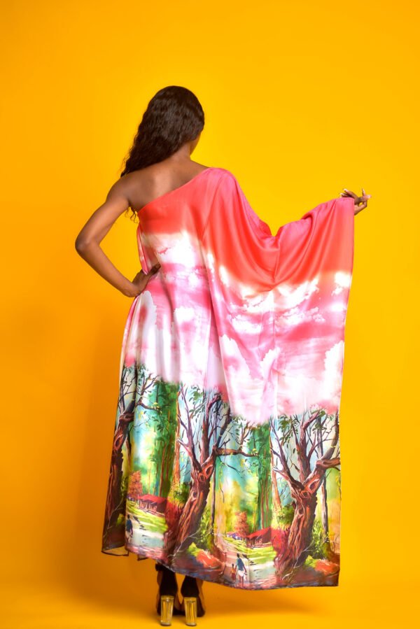 La Robe Flore est une pièce majestueuse et colorée, conçue dans un tissu fluide aux teintes rose et blanche avec des motifs de nuages et une base illustrant une scène naturelle avec des arbres et des personnages. Sa coupe asymétrique à une épaule et sa longue jupe évasée offrent un style bohème sophistiqué, parfaite avec des talons noirs pour un look éclatant sur Kashara.