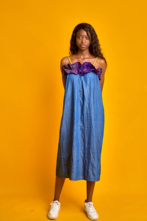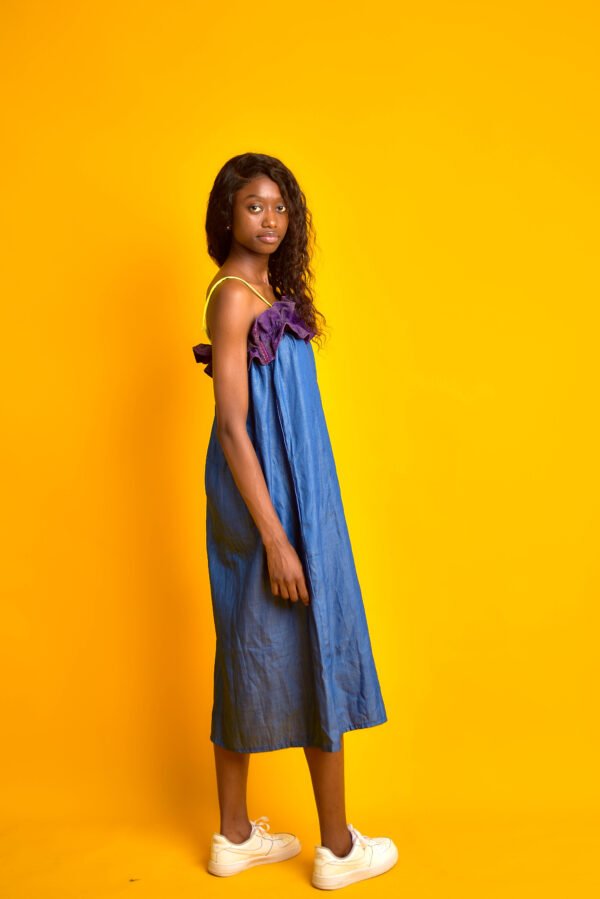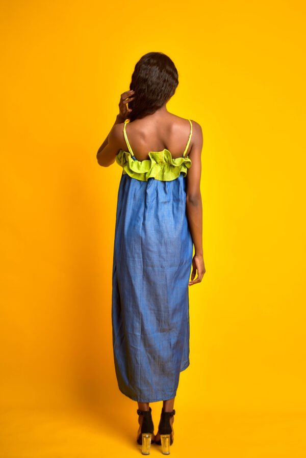 La Robe Gabi est une pièce élégante et audacieuse, combinant un corps bleu profond avec une partie supérieure ornée de volants verts éclatants. Sa coupe fluide et ses bretelles fines offrent un style décontracté mais sophistiqué, idéale pour un look vibrant sur Kashara. Parfaite avec des sandales assorties.