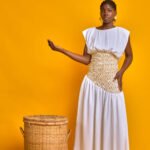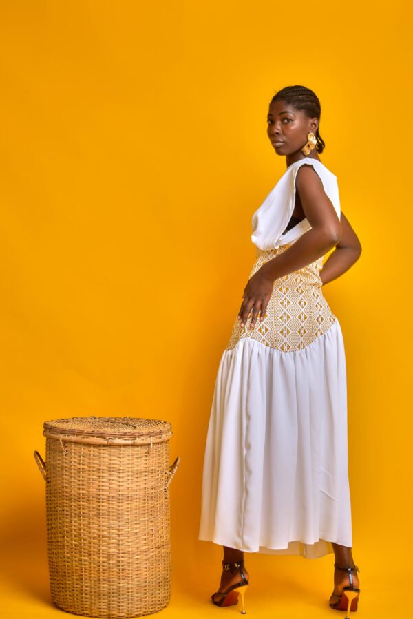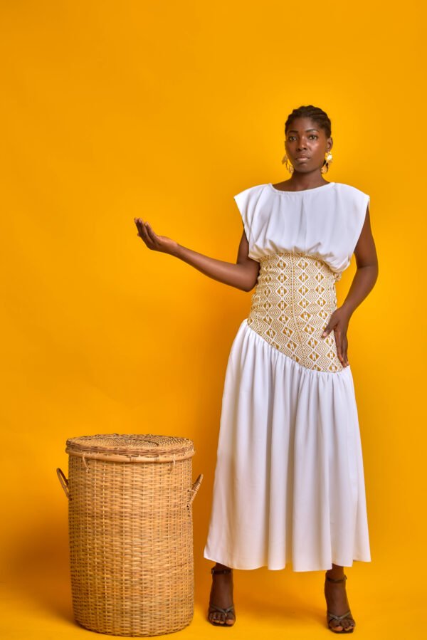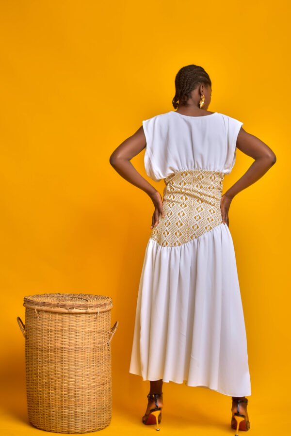 La robe Queeny est une pièce élégante blanche à manches courtes, avec une taille marquée par un corset à motif géométrique jaune et blanc. Sa jupe longue et fluide offre un style raffiné, parfait avec des talons.
