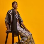 La veste Akiko est un kimono noir orné de motifs géométriques blancs, avec des franges sur les bords. Elle présente des manches courtes et une coupe fluide, idéale avec un pantalon à motifs assortis.